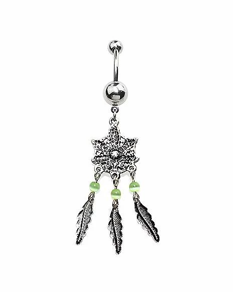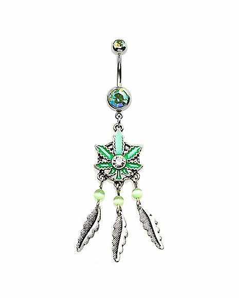 Best Pirce ⭐ CZ Aurora Borealis Effect Weed Leaf Dream Catcher Dangle Belly Ring – 14 Gauge ⌛