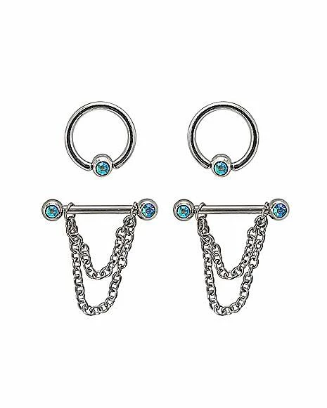 Coupon 𧨠CZ Blue Captive Bead Rings and Chain Dangle Nipple Barbells 2 Pair – 14 Gauge π