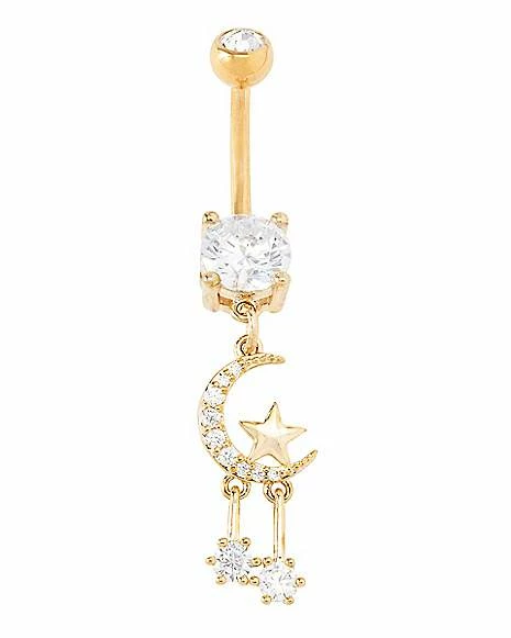 Hot Sale π CZ Goldtone Moon and Star Dangle Belly Ring – 14 Gauge π