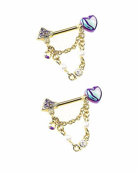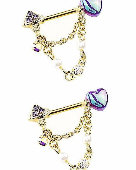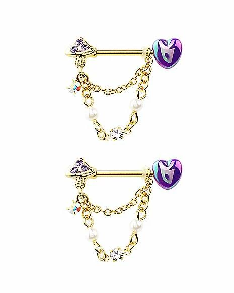 Hot Sale π CZ Heart and Mushroom Goldtone Chain Nipple Barbells – 14 Gauge π