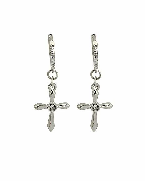 Coupon π CZ Silvertone Ornate Cross Huggie Dangle Earrings π
