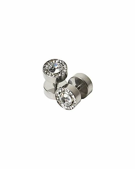 The Clear Stone Cubic Zirconium Fake Plug Set features a large clear stone surrounded by several smaller gems. Thread closures make this classy pair of earrings easy to wear!