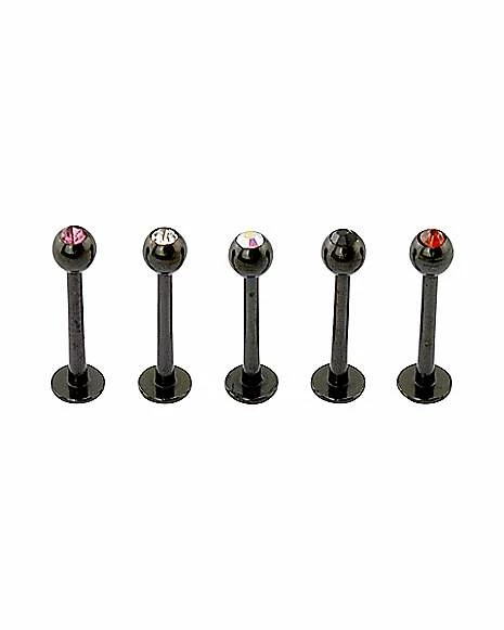 This black cubic zirconia labret set contains FIVE pieces and is available in 16G; 3/8″.