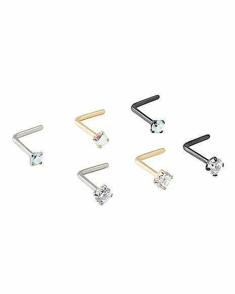 Wholesale π Multi-Pack CZ Aurora Borealis Effect Silverplated Goldtone and Rose Goldtone Titanium L-Bend Nose Rings 6 Pack – 20 Gauge β¨
