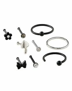 Budget π Multi-Pack CZ Black Hoop Nose Rings and Bone Nose Rings 9 Pack – 20 Gauge π