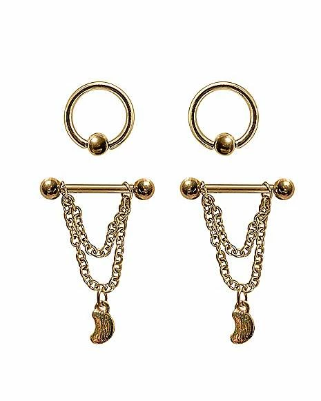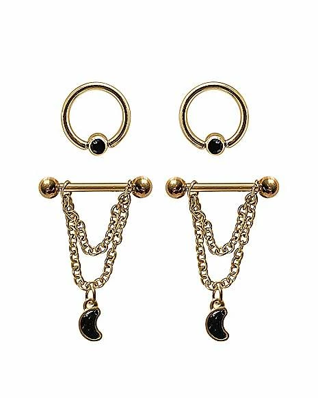 Budget π₯° Multi-Pack CZ Black Moon Captive Bead Rings and Chain Dangle Nipple Barbells 2 Pair – 14 Gauge β