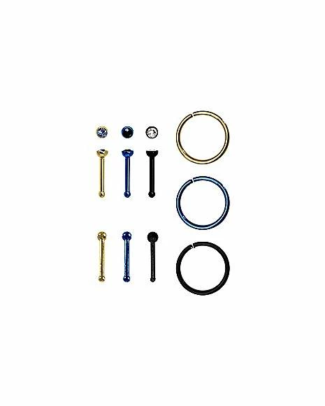 Cheap ⌛ Multi-Pack CZ Blue Gold Black Bone and Hoop Nose Rings 9 Pack – 20 Gauge ✔️