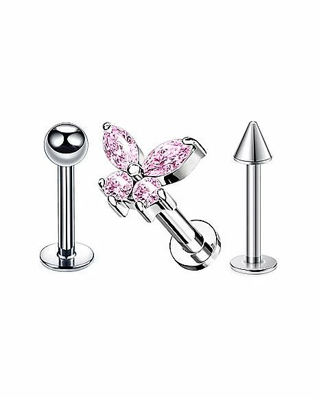 Promo π Multi-Pack CZ Butterfly and Silvertone Cone and Ball Labret Lip Rings 3 Pack – 16 Gauge π