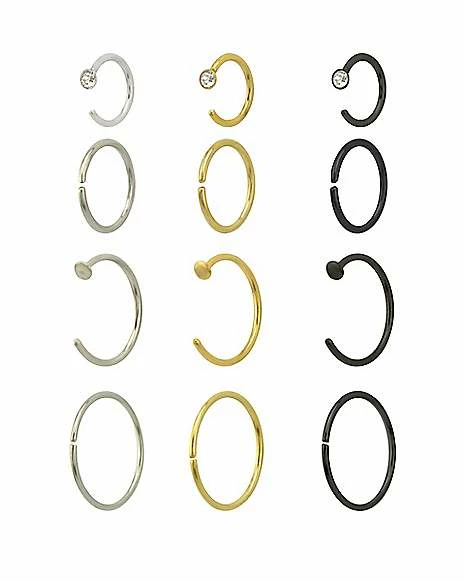 Hot Sale π Multi-Pack CZ Goldtone and Black Hoop Nose Rings and Half Hoop Nose Rings 12 Pack – 20 Gauge π