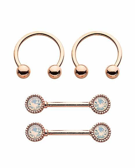 Flash Sale π Multi-Pack CZ Opal-Effect Rose Gold Plated Nipple Barbells and Horseshoe Rings 4 Pack – 14 Gauge π§¨