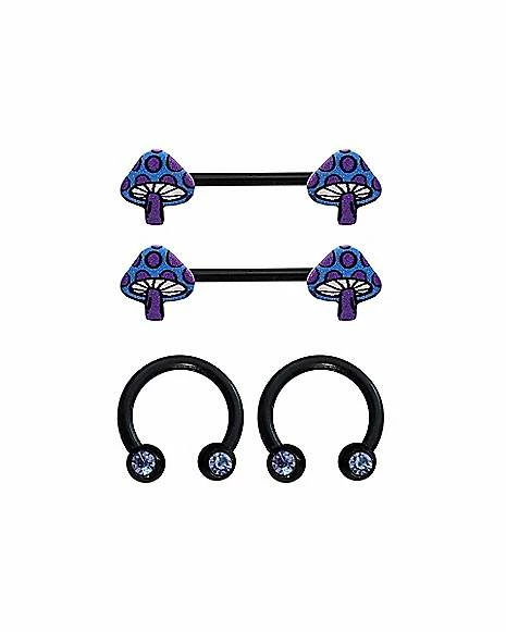 Budget β€οΈ Multi-Pack CZ Purple Mushroom Horseshoe Rings and Nipple Barbells 2 Pair – 14 Gauge π₯°