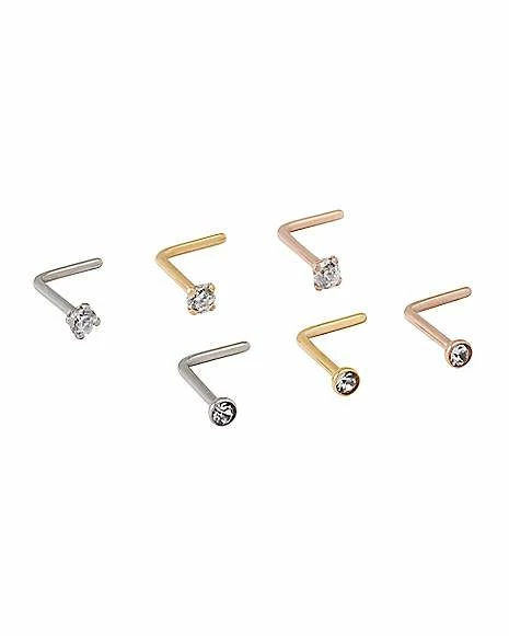 Deals π€© Multi-Pack CZ Silverplated Goldtone and Rose Goldtone Titanium L-Bend Nose Rings 6 Pack – 20 Gauge π