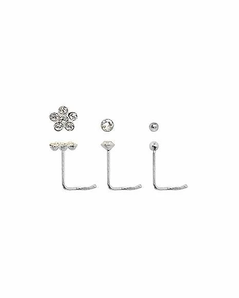 Hot Sale β Multi-Pack CZ Silvertone Flower L Bend Nose Rings 3 Pack – 22 Gauge π€©
