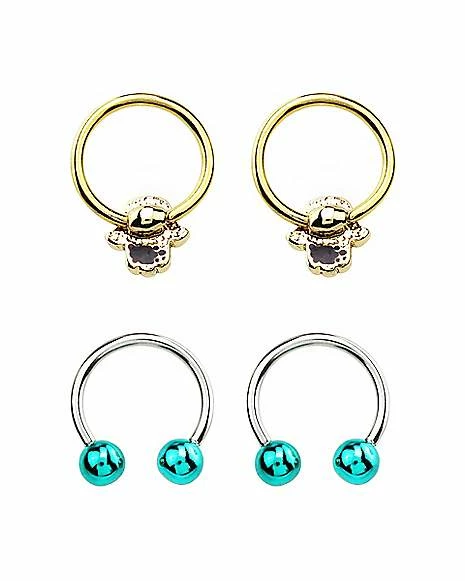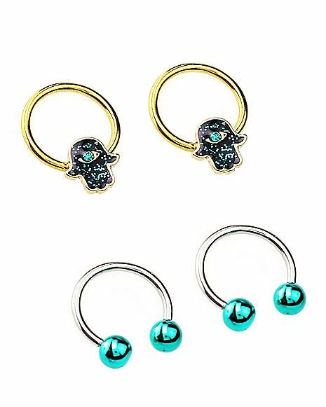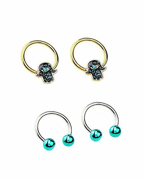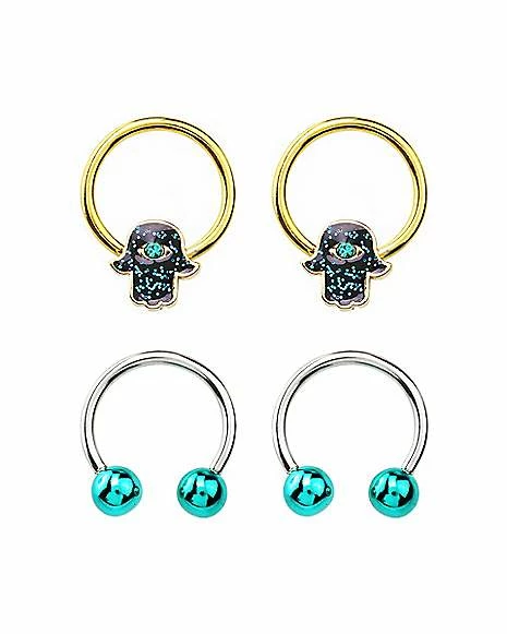 Wholesale β€οΈ Multi-Pack CZ Teal Hamsa Hand Horseshoe and Captive Rings 2 Pair – 16 Gauge π₯
