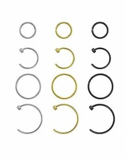 Wholesale π Multi-Pack Silvertone Goldtone and Black Hoop and Half Hoop Nose Rings 12 Pack – 20 Gauge π