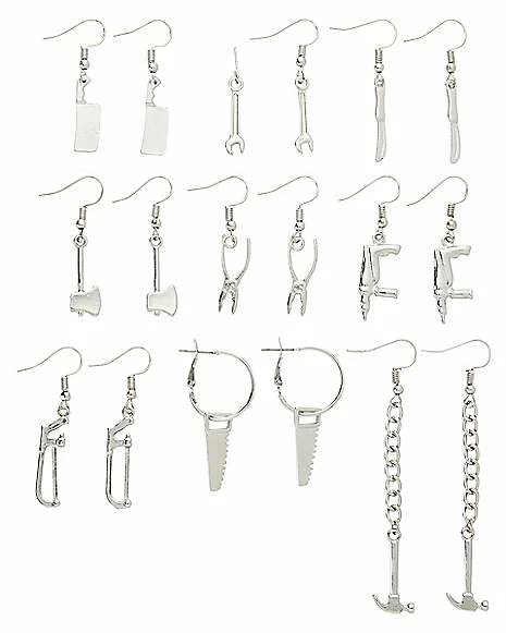 Budget β Multi-Pack Silvertone Knife Axe π¨ Hammer Weapon Dangle Earrings – 9 Pair β€οΈ